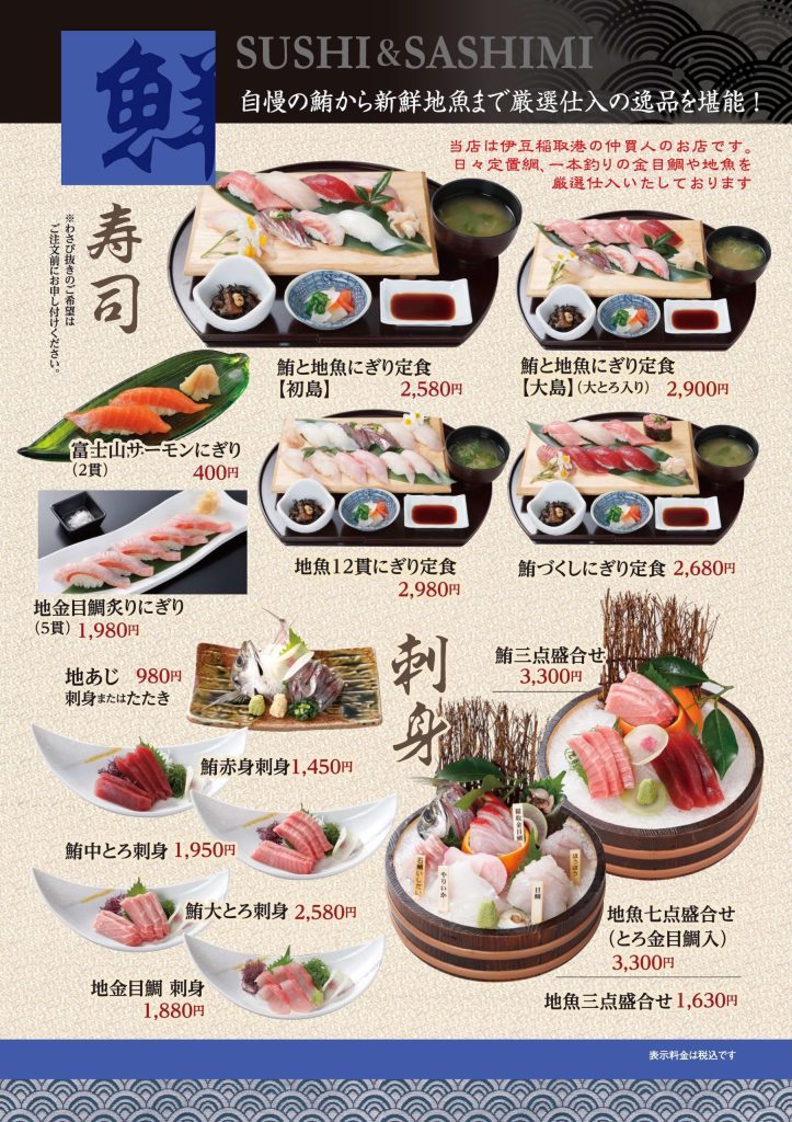 日々美味しい鮪とその希少部位に加えて、稲取港直接買い付けの金目鯛、地魚などを厳選仕入して、お客様に美味しく喜んでいただくことを